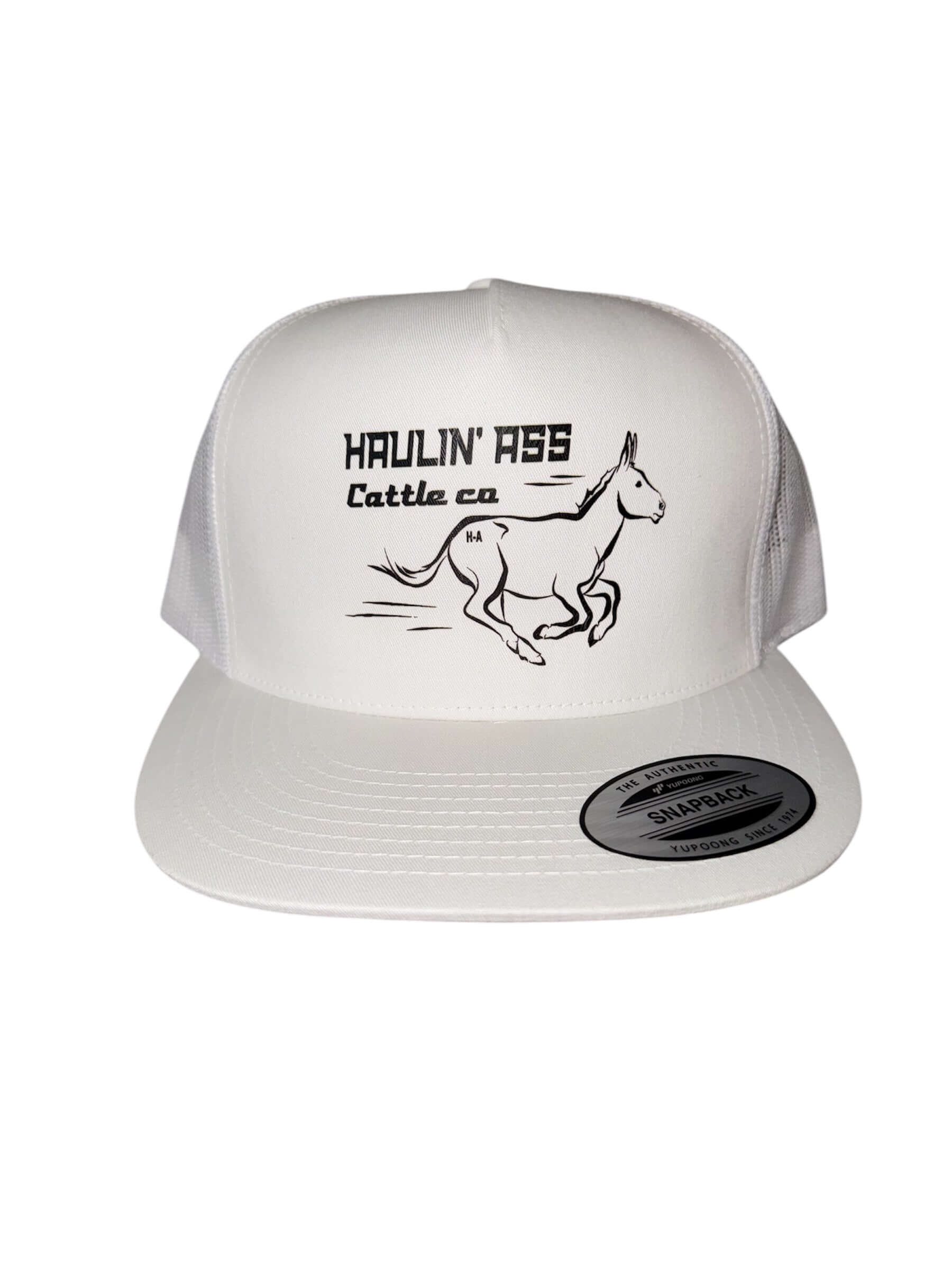 Haulin’ ass cattle co on a white yupoong 6006 classic SnapBack.
