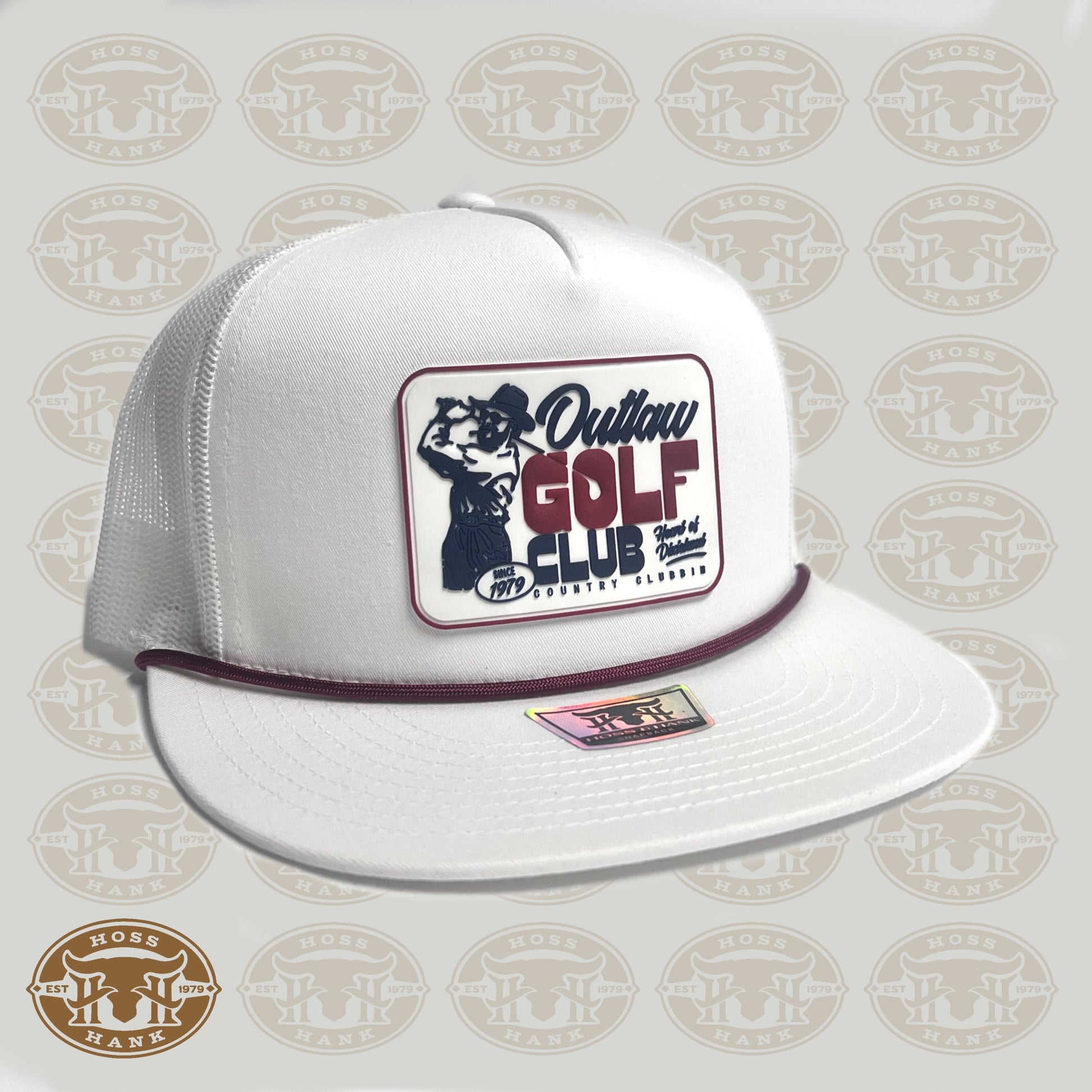 Experience the ultimate in style and function with our cream and black high crown SnapBack. Featuring a sleek rope detail and the iconic Hoss&Hank outlaws golf club logo, this hat is perfect for everyday wear or adding a touch of personality to your collection. Don't miss out on this must-have accessory!
