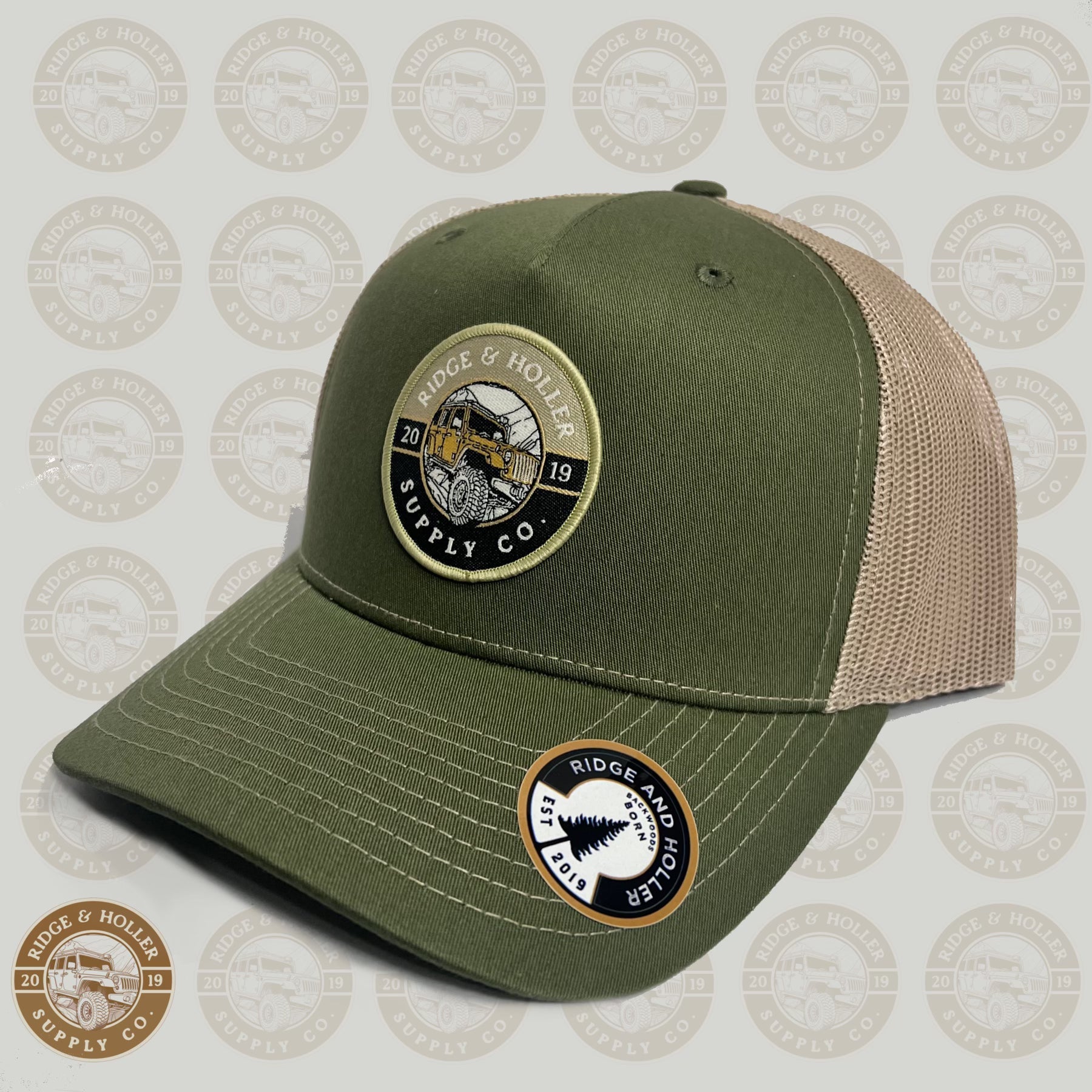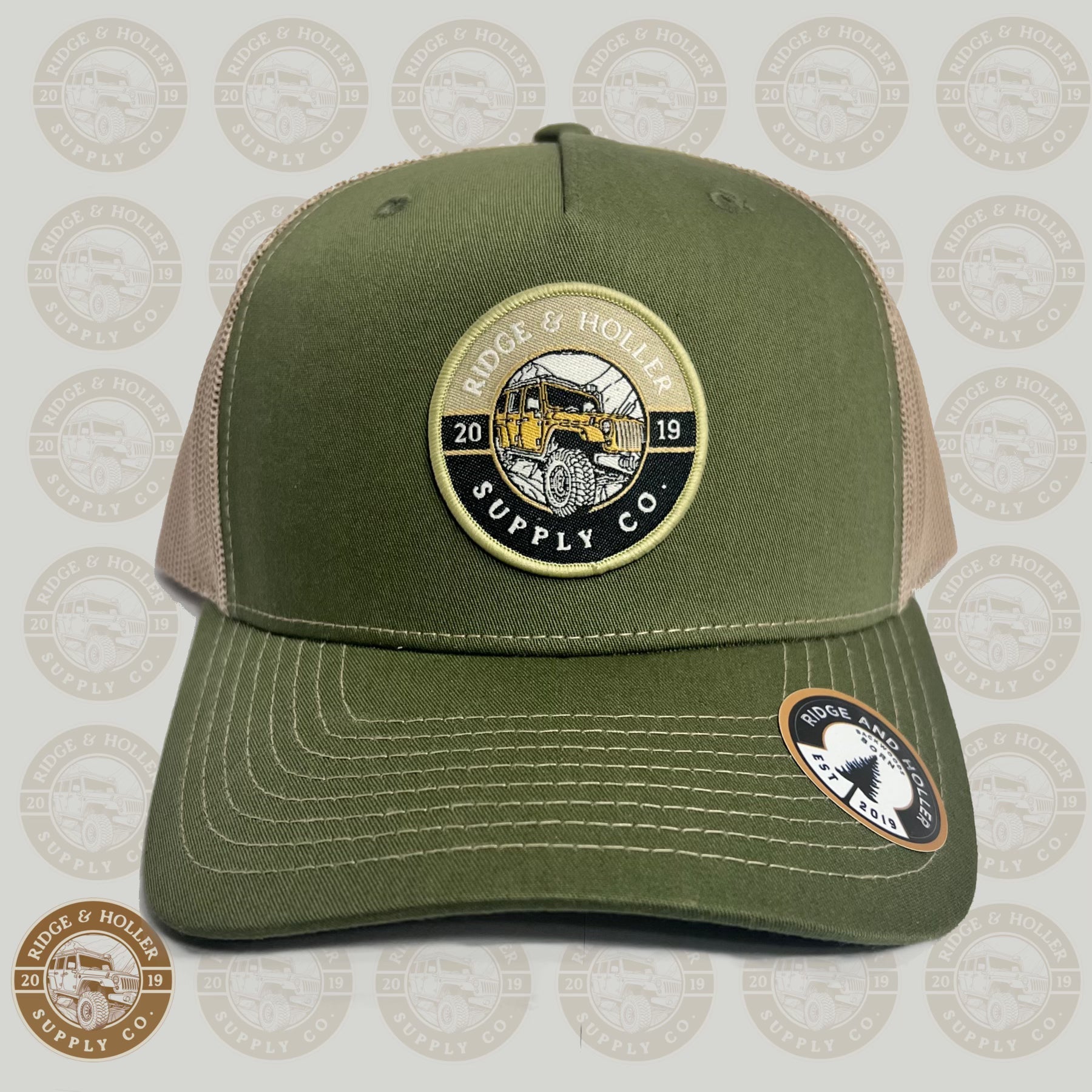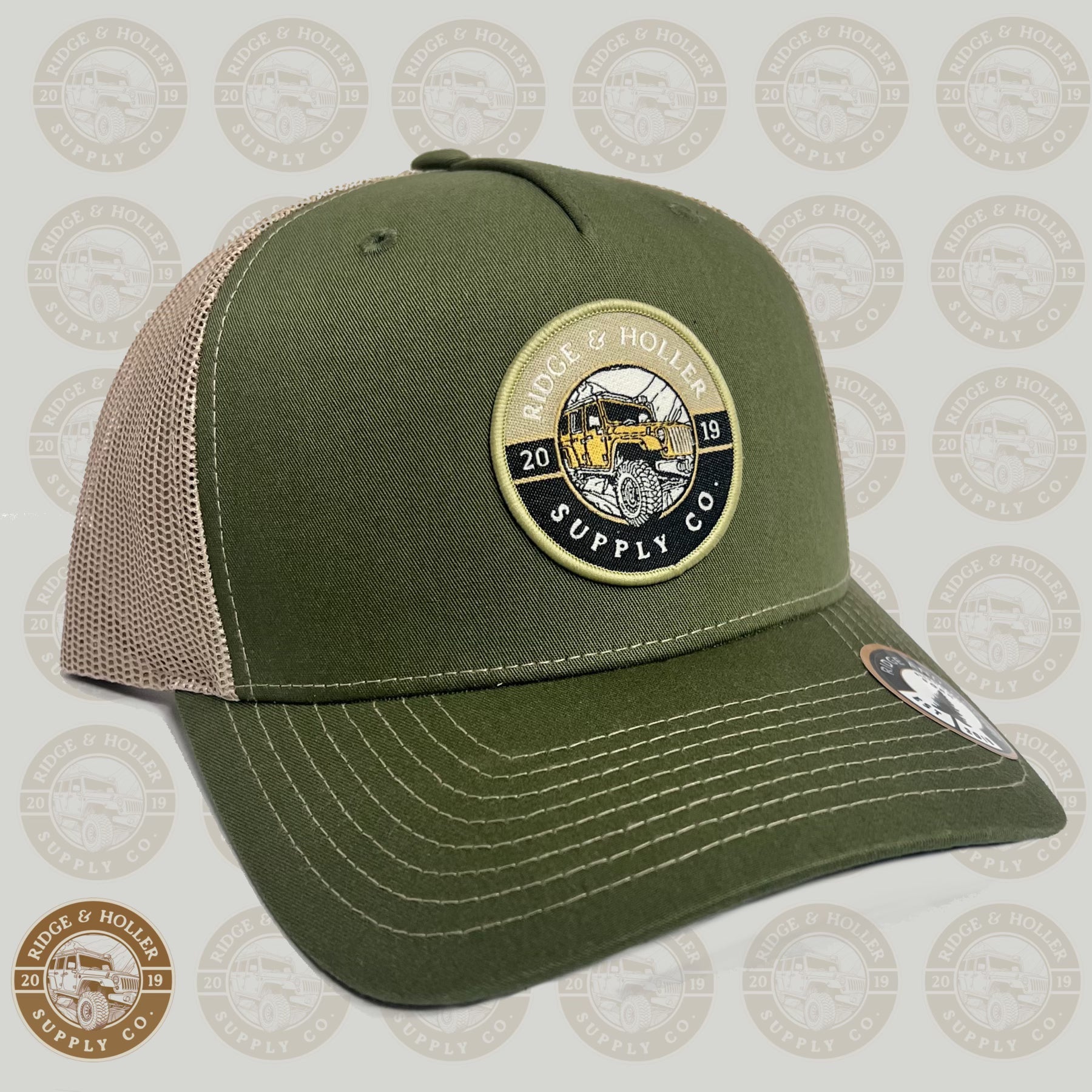 Explore the latest Ridge&Holler hat, showcasing a Jeep on the backroads on a mid rise SnapBack design with a moss and khaki.